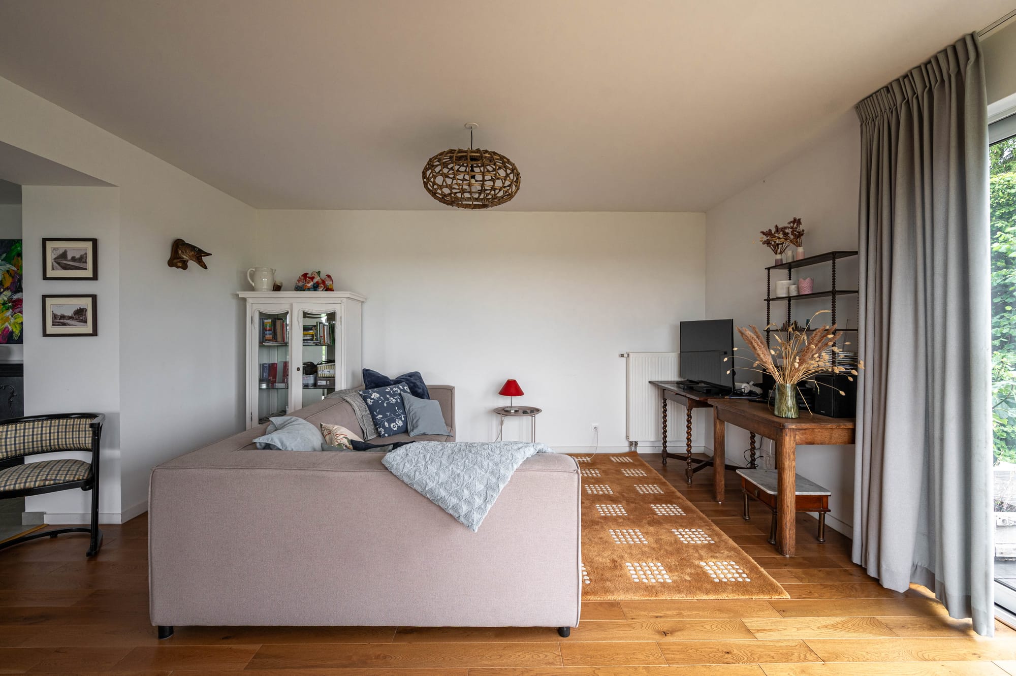 Een ruime leefruimte met salon en houtkachel.