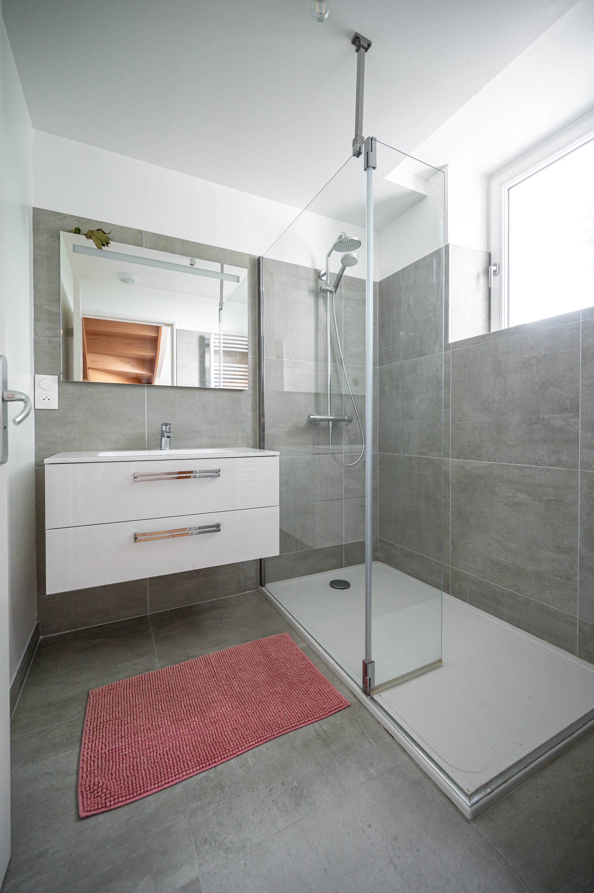 Twee badkamers met elk een douche en lavabo.