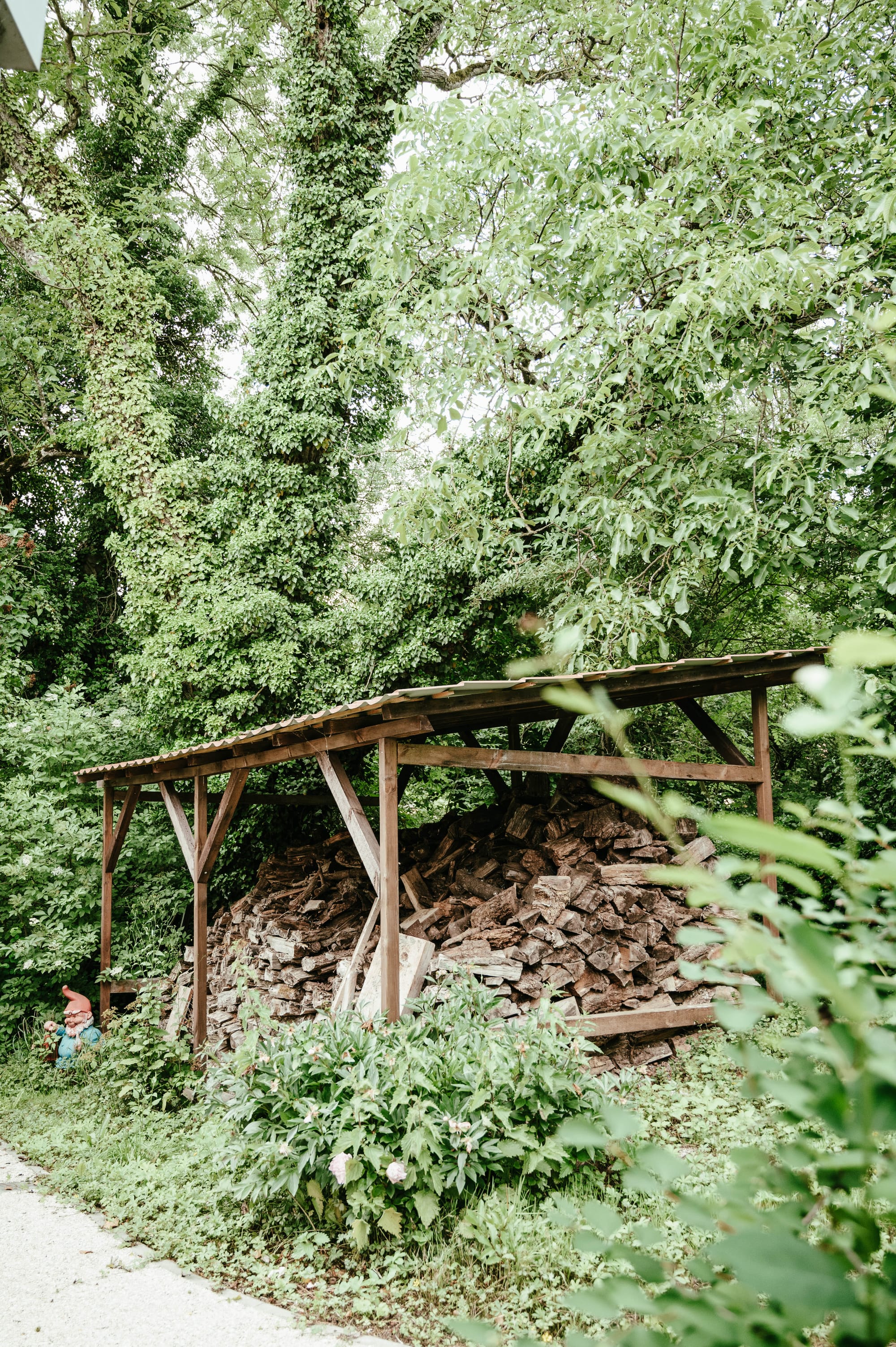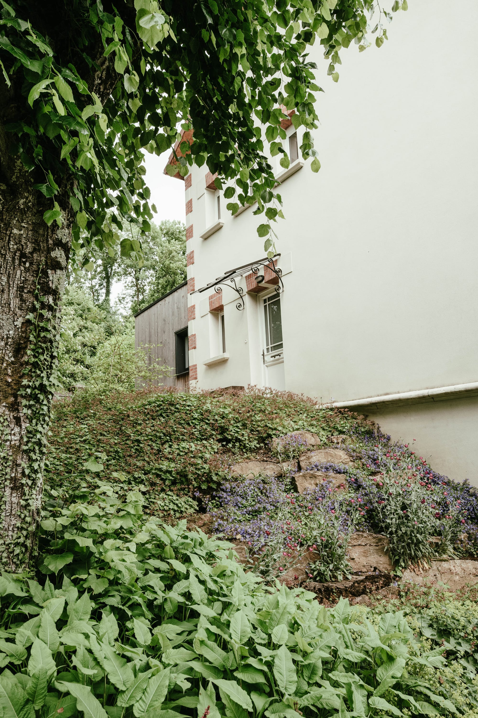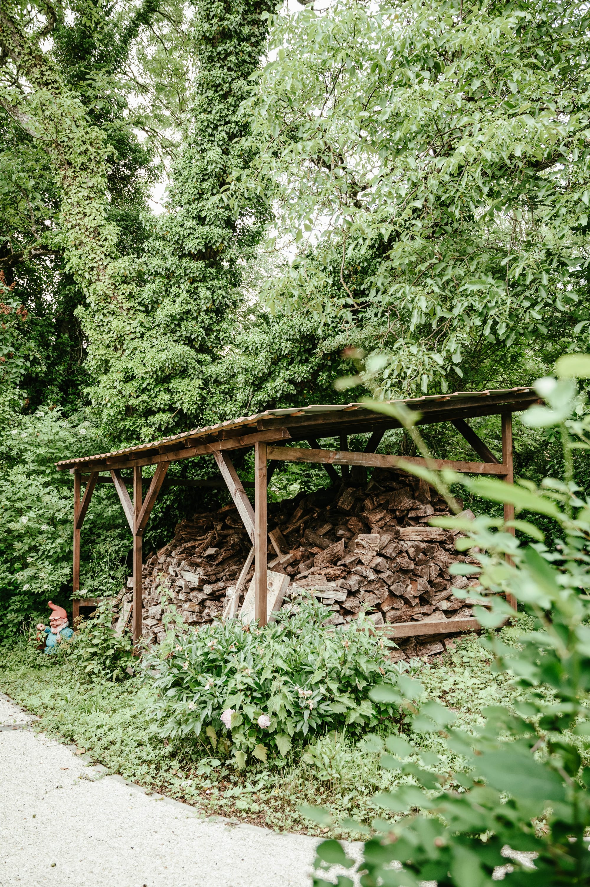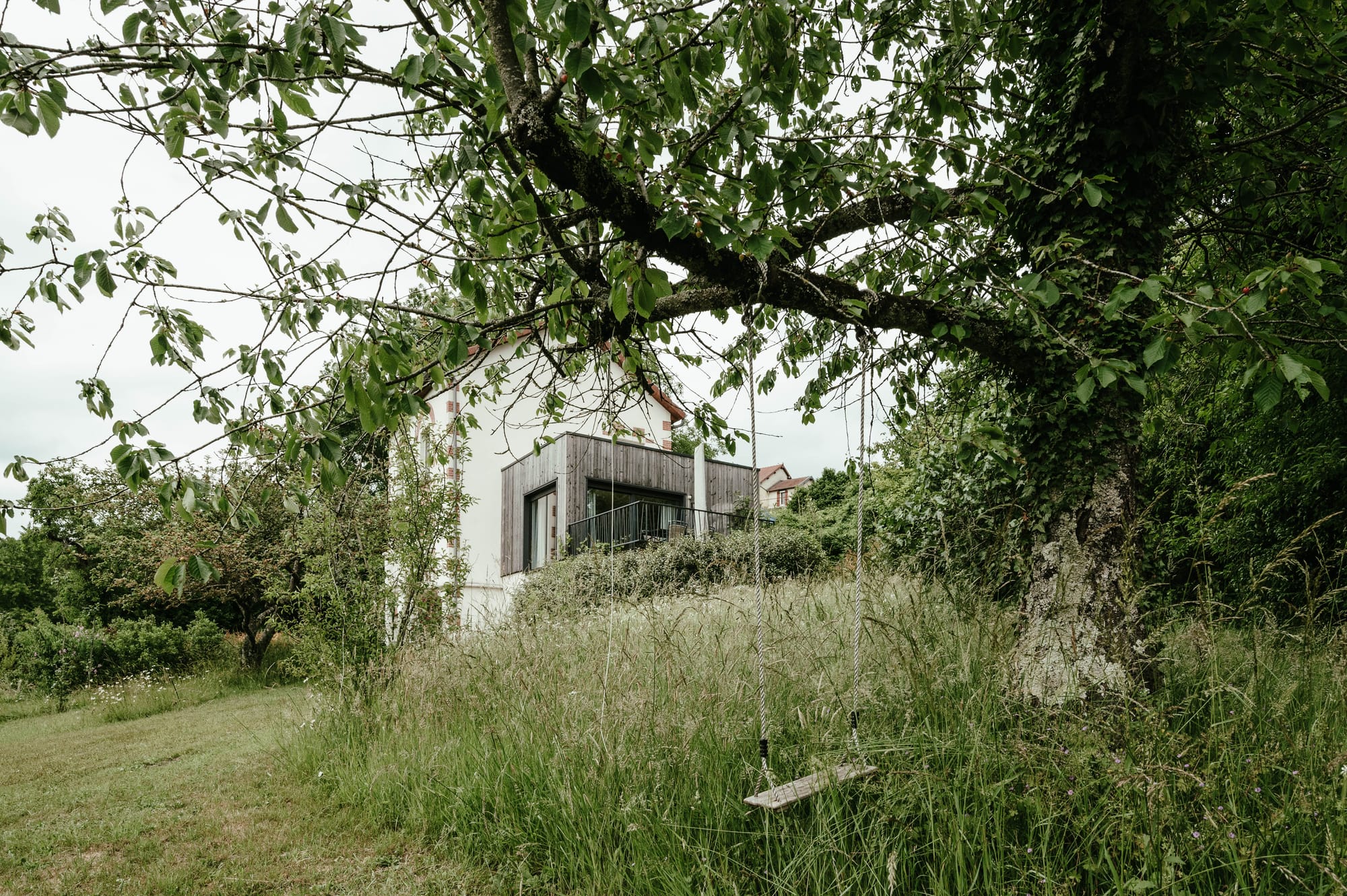 Vanaf het terras loop je de ruime tuin in. Je vindt er appels, peren, pruimen, mirabellen, vijgen, bessen en noten, maar ook wilde orchideën en tientallen wilde bloemen. De wagen kan je parkeren op de oprit, onderaan het perceel.